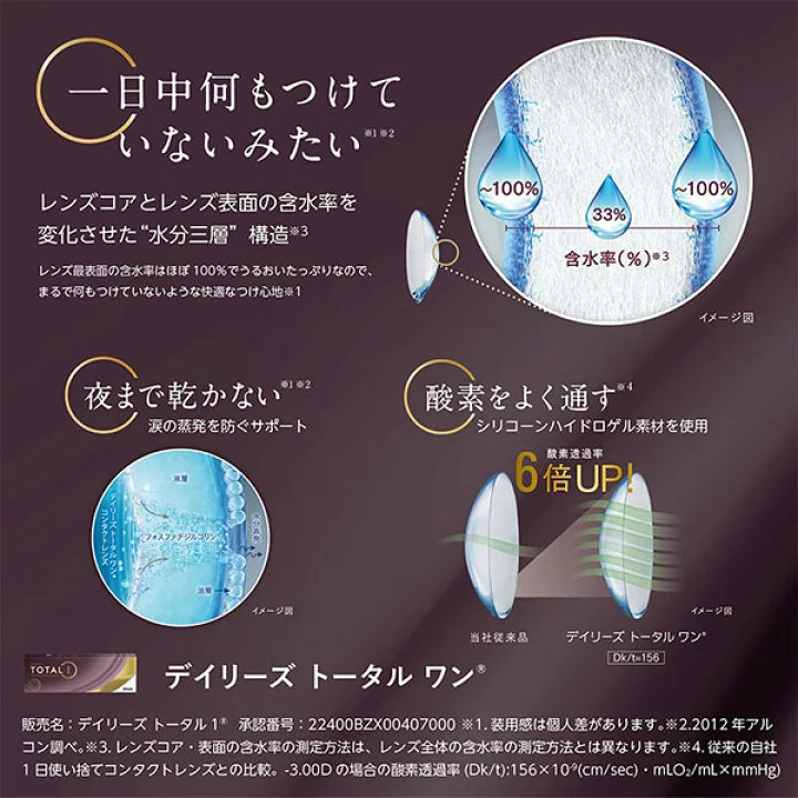 酸素をよく通す。角膜も呼吸しているため、酸素不足になると目の充血や病気を引き起こす可能性があります。デイリーズ トータル ワン®のレンズはシリコーンハイドロゲル素材を使用。従来のコンタクトレンズと比べ、6倍の酸素を目に通します。